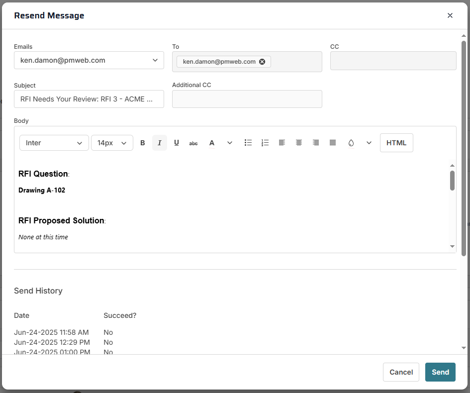 This dialog opens when you click the Resend Message buttons in the Workflow Tab Workflow Log Toolbar or in the Collaborate Tab. Use the dialog to view and resend messages created by PMWEB Visual Workflow or Collaborate processes. The Send History section displays each date and time that the message was sent.