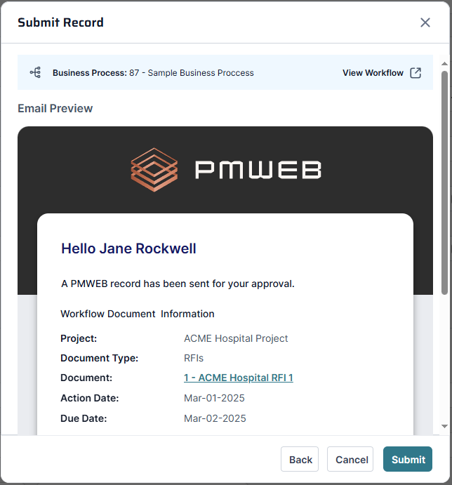![]() The title of this bar shows the Visual Workflow business process that will be assigned to the record when you finish the Submit action. Click the View Workflow button to open the View Workflow Dialog.