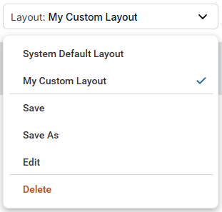 This field only shows if multiple layouts are allowed for the table. Select a layout in the top section of the dropdown to apply it to the table. The System Default Layout always appears at the top of the list. The currently loaded layout is checked. The middle section of the dropdown allows you to save, save as, and edit the currently loaded layout. Click Edit to open the Grid Layout Dialog.