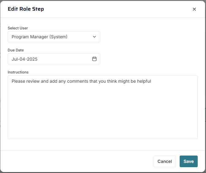 Workflow Edit Role Step Dialog If you have security permission, you can use this dialog to edit some of the details of a Visual Workflow role step for a business process assigned to a record.